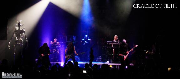 Dann kommen wir schon zum Headliner des Abends: CRADLE OF FILTH. Meine letzte Livebegegnung mit den Briten muss sicherlich 10 Jahre her sein und hat, glaube ich, damals auf dem Wacken stattgefunden. Da war ich sehr positiv überrascht, dass Dani Filth seine langen Kreischeinlagen wieder über das gesamte Konzert konstant durchziehen konnte, darauf freute ich mich heute auf jeden Fall. Das Publikum war sehr gemischt. Von Fans im mittleren Alter mit Originalmerch aus den ´90ern über Fans, die in den ´00er Jahren zur Band gefunden haben, bis zu neuen jugendlichen Fans in Begleitung eines Erziehungsberechtigten war wirklich alles dabei. Durch Fragen an uns, waren wir uns auch sicher, dass hier Leute ihr erstes Konzert erlebten.