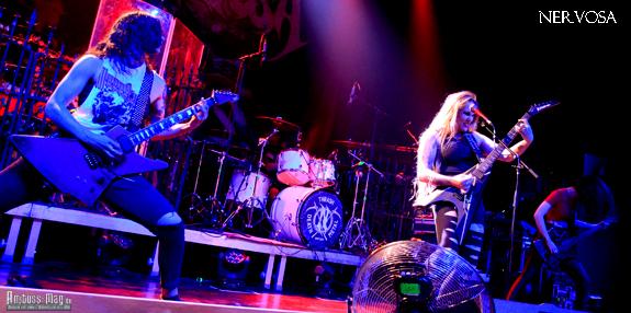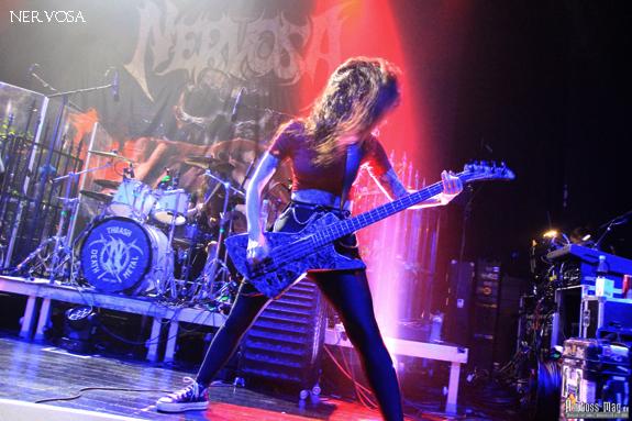 Als offizieller Support für die Tour kamen als nächstes NERVOSA, die All-Female-Death-Thrash-Band, auf die Bühne und feierten auf dieser Tour gleichzeitig ihr 15-jähriges Bestehen. Sängerin und Gitarristin Prika Amaral, das einzig verbliebene Originalmitglied, machte einen sehr routinierten Eindruck, von dem die anderen Bandmitglieder auf jeden Fall profitieren konnten. Einstudierte Bewegungen der ganzen Band und Abläufe machten zwar einen guten Eindruck, ließen das Ganze gleichzeitig aber auch etwas zu durchgeplant wirken. Musikalisch waren sie einen Tacken härter als die Vorband, konnten mich aber nicht so recht überzeugen. Einziger Kritikpunkt, die Gitarrensoli der Sängerin waren leider nicht zu hören.