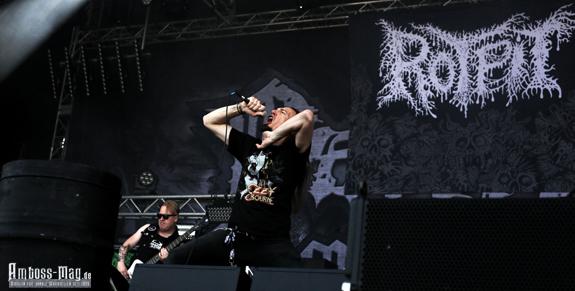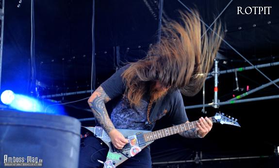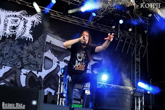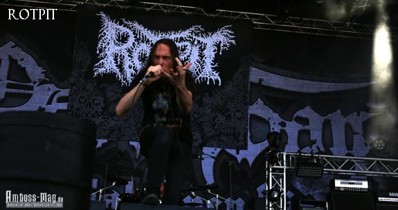 Die erste Band des Festivals sehen wir uns jedes Jahr an. Dieses Mal gab es mit ROTPIT eine schwedisch-deutsche Kollaboration, die „finnischen“ Death Metal spielt. Ein paar Tage vorher haben sie ihren ersten Gig überhaupt gespielt, in Schweden. Hiermit also ihr erster Auftritt in Deutschland und dann gleich Opener auf dem Party.San! Da haben die Szenekontakte von Ralf von Revel In Flesh sicherlich mitgewirkt. Mit persönlich haben sie mit ihrem Groove sogar besser gefallen, als seine andere Band, die ja grad auf Eis liegt. Das Wort Rot wurde inflationär benutzt, kann auch in vielen Songtiteln vor. Und eine Coverversion von Abszess war auch noch drin. Top Start!