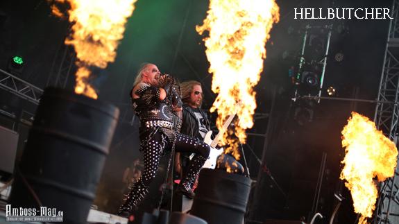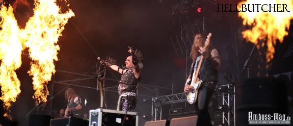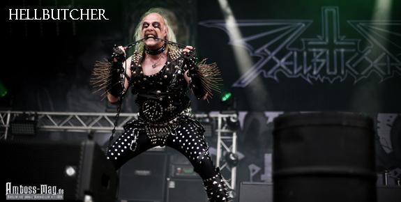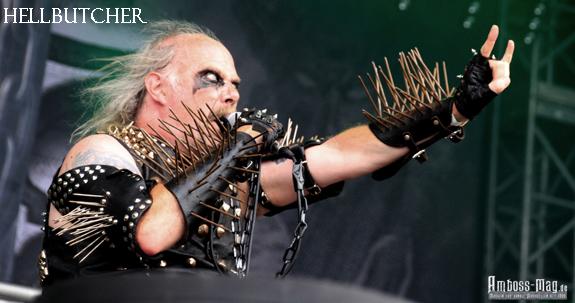 Nifelheim hatten Kultfaktor, waren aber nie so ganz meins. Die neue Formation HELLBUTCHER von Nifelheimzwilling Per konnte da wesentlich besser bei mir landen. Anspruchsvoller und weniger chaotisch geht man hier zu Werke, was meinen Ohren mundet. Per ist ein absolut perfekter Frontmann für diese Art von Black Metal. Leder, massenhaft Nieten, Corpsepaint und viel Feuer machten diesen Auftritt in Kombination mit Pers Gebärden auf der Bühne zu einem visuellen Augenschmaus. Ich war völlig hin und weg, womit ich gar nicht gerechnet hatte. 6 Songs des Albums, beide des Demos und zum Abschluß noch 2 Cover, einmal Maiden und einmal Venom! Und die Truppe die Per um sich geschart hat, hat es in sich. Da liest man Bandnamen wie Unleashed, Bloodbath, Aeternus und Gravdal und dabei ist man da nur bei den aktuellen Bands. HELLBUTCHER bleiben auf jeden Fall auf meinem Zettel. Das war eindrucksvoll!