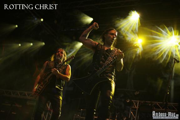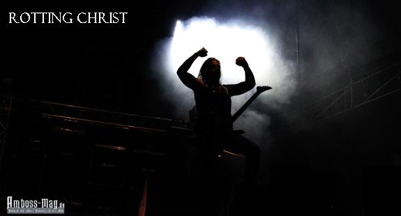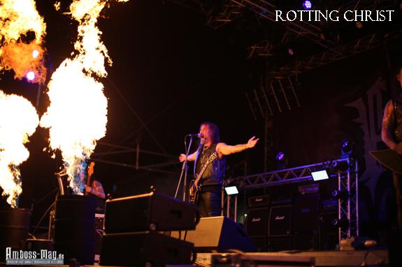 Die griechischen BM-Vorreiter mit Kultstatus, ROTTING CHRIST, waren bereits zum dritten Mal auf dem Party.San gebucht. Gesehen hatte ich sie bisher noch nicht. Warum? Keine Ahnung. Musikalisch waren sie für mich nie wirklich interessant, aber gesehen haben wollte ich sie dieses Jahr auf jeden Fall, des Kultes wegen. Ein Fan bin ich nach dem Auftritt jetzt nicht, aber gelohnt hat es sich trotzdem. Das zahlreich anwesende Publikum, hat die Band gefeiert.