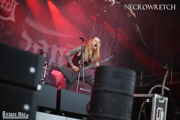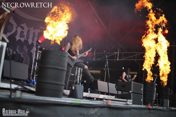 Die französischen Death und Black Metaller NECROWRETCH waren mir vorher kein Begriff. Das aktuelle Album „Swords Of Dajjal“ von 2024 habe ich deswegen angetestet und es hat mir gut gefallen. Live konnten sie mich dann noch mehr überzeugen. Es war schon ziemlich warm und trotzdem wurde mit Feuer nicht gegeizt. Für das Publikum, welches nicht grad in den ersten 3 Reihen steht eher unwichtig, im Fotograben auf jeden Fall eine Strapaze. Aber ich wurde sehr gut unterhalten und die Band ist positiv in Erinnerung geblieben, konnten sie das Publikum ab 13.45 trotz des Wetters doch gut in Stimmung und Schwingung bringen, am Ende gab es sogar Crowdsurfer.