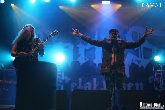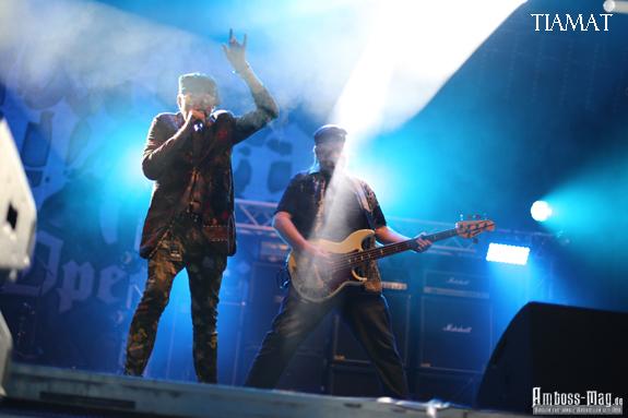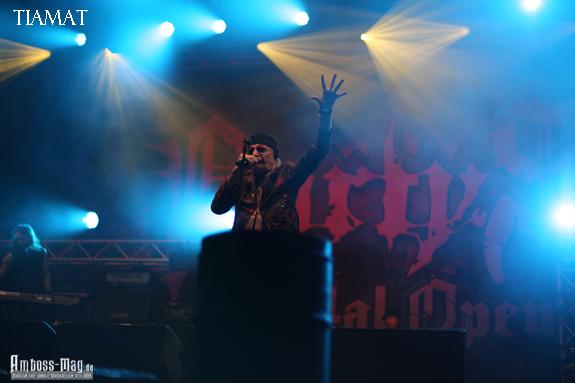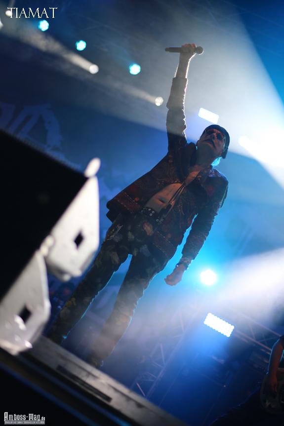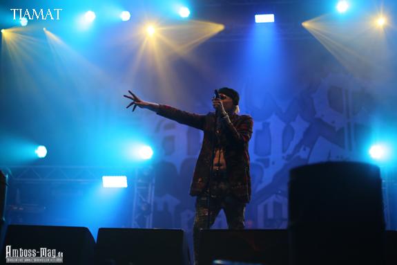 Wenn ich mich für EINE Band hätte erbrechen müssen, wegen der ich zum Party.San gefahren bin, hätte ich nur TIAMAT sagen können. Die „Wildhoney“ fand ich schon immer großartig. Live gesehen habe ich sie vorher noch nie und war etwas verunsichert, weil ich von vielen negatives gehört habe, darauf habe ich noch dann auch eingestellt aber trotzdem gehofft. vor allem die Geschichte mit dem Brötchen essen war bei mir hängen geblieben. Und? Was soll ich sagen? Die vielen lagen nicht so weit daneben. Ich stand im Fotograben und als Johan die Bühne betrat, wusste ich nicht was ich sagen sollte. Barfuß, in Indien Klamotten, mit fettem Tatter stand der Mann vor mir, der eine meiner liebsten Scheiben für den Herbst zu verantworten hat. Soundtechnisch war alles super und auch der Gesang war auf dem Punkt. Die Band war top, und Johan hat sie vorgestellt und sich auch bei ihr bedankt. Körperlich schien Johan in keiner guten Verfassung zu sein. Da war nicht viel Bewegung oder Enthusiasmus zu spüren. Nach den drei Songs in Graben bin ich ratzfatz zum Zelt, hab mir ne ziemlich harte Mische gemacht und mich im hinteren Teil des Infields auf die Asphaltkante gesetzt. Ansehen konnte ich mir das Ganze nicht, ich hatte das Gefühl Hilfe leisten zu müssen. Von hinten zuhören hingegen hat mich mehr als erfüllt. Die „Clouds“ trifft auf Scheibe von Sound nicht meinen Geschmack, die sind schon eher. Richtig gut wurde es aber erst mit dem Songs von „Wildhoney“. „Whatever That Hurts“ machte mir schon massive Gänsehaut. Ein paar Meter von mir entfernt saß ein Mann der sicherlich 15-20 Jahre älter als ich, aber genauso ergriffen, wenn nicht sogar noch mehr. Als „Gaia“ den Abschluss eingeläutet hat, bekam ich wieder eine mächtige Gänsehaut und der Herr neben mir fing an zu weinen, vor Rührung! Als der Song und damit der Auftritt vorbei war, fielen wir uns in die Arme und waren beseelt!