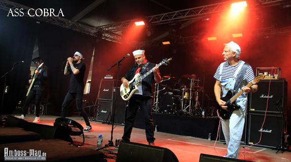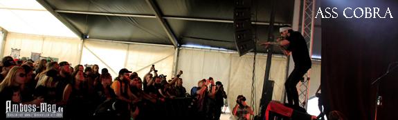 Mittlerweile hat es sich ja schon fast etabliert, dass am frühen Samstag Tribute Bands das Zelt rocken. Dieses Jahr gibt es mit ASS COBRA einen Vertreter dieser Fraktion, der uns Turbonegro serviert. Es gibt mehr als einige Turbojugendjacken im Publikum zu sehen und viele Leute feiern diesen Auftritt frenetisch mit. Sänger Lars, sonst bei Décembre Noir, zeigt sich hier von einer anderen Seite. „All My Friends Are Dead“ zum Start füllt das Zelt schnell, welches ja immer zum ersten Ton öffnet. Das Publikum feiert die Band und ihr zugrundeliegendes Original mächtig ab um diese frühe Uhrzeit!