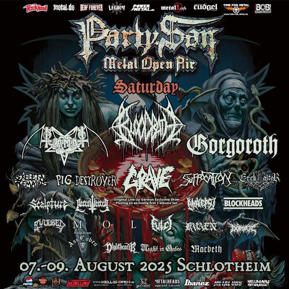 SCALPTURE, die sympathischen Jungs aus Bielefeld, mit denen wir 2022, als sie auf der Zeltbühne des Party.San antreten durften, schon ordentlich gefeiert haben, konnten dieses Jahr den letzten Festivaltag auf der Hauptbühne eröffnen. Bei 2-8 gemeinsamen Getränken am Vortag, waren sie schon etwas nervös und Samstagmittag um 12h umso mehr. Konnte sie uns vor 3 Jahren schon begeistern, haben sie dieses Mal noch eine Schippe draufgelegt und das in Verbindung mit der großen Bühne, Respekt! Das Publikum war auch schon wirklich zahlreich vor der Bühne vertreten und bekam als Dank eine fette Death Metal Schelle von den Jungs. Sie sind auf der Bühne eine Einheit, was man definitiv auch sehen kann. Sie lassen sich in ihren Songs fallen um zwischen ihnen zu lachen, zu scherzen und den Moment zu genießen. Es war eine wahre Wonne ihnen zuzusehen und man freute sich direkt mit ihnen. Beim letzten Song wurde extra für die Jungs ein Schuss von Esmiralda abgefeuert, womit niemand gerechnet hat. Außer vielleicht wir, eventuell, ein kleines bisschen. Nach dem Auftritt rannten wir in Rudi vom Magazin Hotel666 und gingen zusammen in den VIP-Bereich um die SCALPTURE-Jungs abzugreifen, wenn sie hinten von der Hauptbühne kommen um ihnen zu gratulieren. Sie waren beschäftigt, aber Sänger Thorsten hat sich einen Moment genommen und ist zu uns gekommen. Ich hab da schon gedacht, dass sie auch gut 2-3 Slots später hätten spielen können, wusste aber noch nicht, dass der Death Metal Headliner samstags jetzt als erstes auf die Bühne geht.
